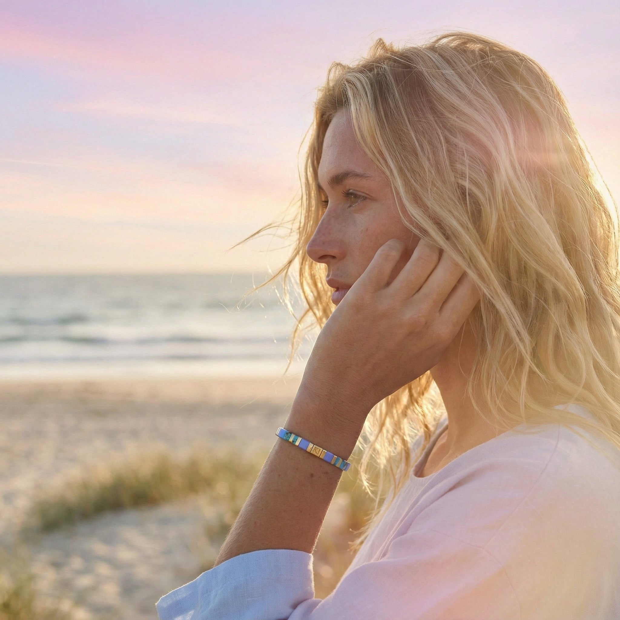 Our journey begins each year in a beautiful bead store hidden in the heart of Tokyo, where shelves glisten with thousands of Miyuki Tila glass beads in every colour of the rainbow. We hand-select every shade and finish, choosing those that capture the ocean’s shimmer, the calm of sunrise, and the joy of colour.