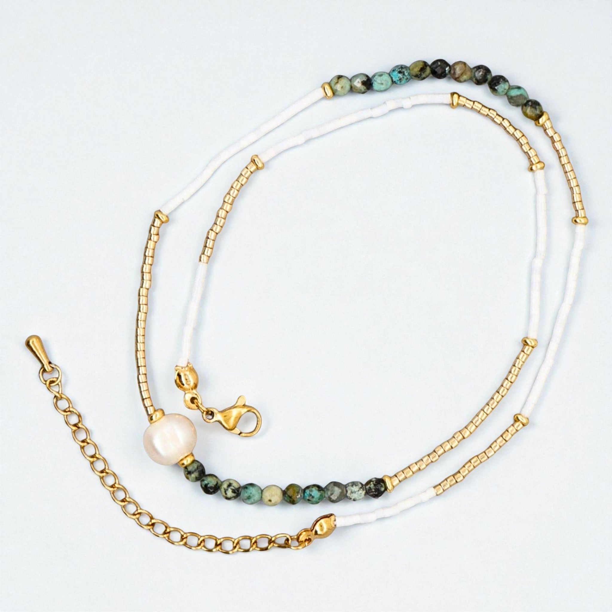 Our Hidden Treasure necklace is a beautiful handcrafted piece, handmade from Miyuki glass seed beads with a stainless steel chain. The pearl pendant adds an elegant and delicate look.