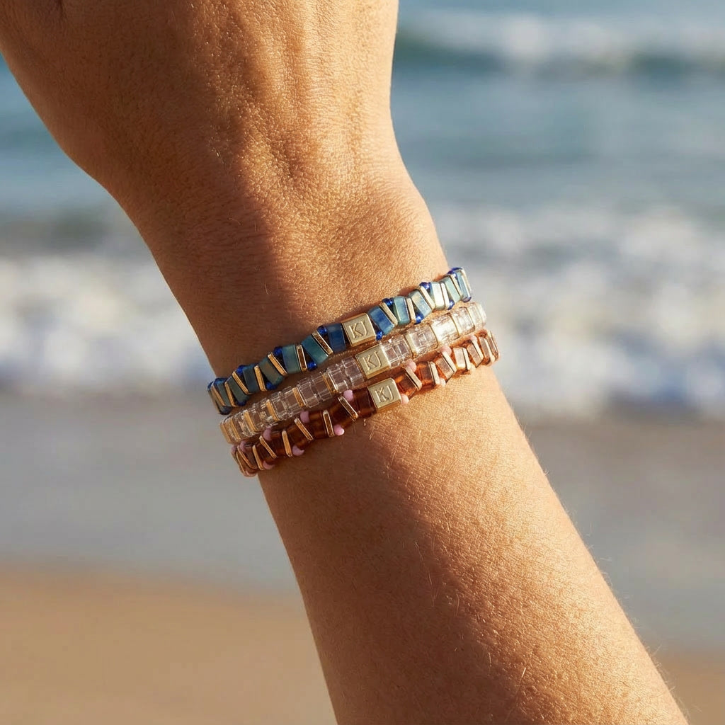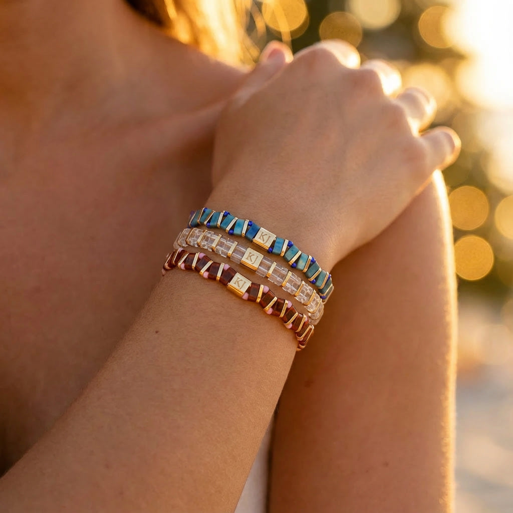 Handcrafted with precision using premium Miyuki Tila glass beads and 24k gold-plated accents, each piece is strung on durable elastic for a comfortable, waterproof, summer-ready fit.