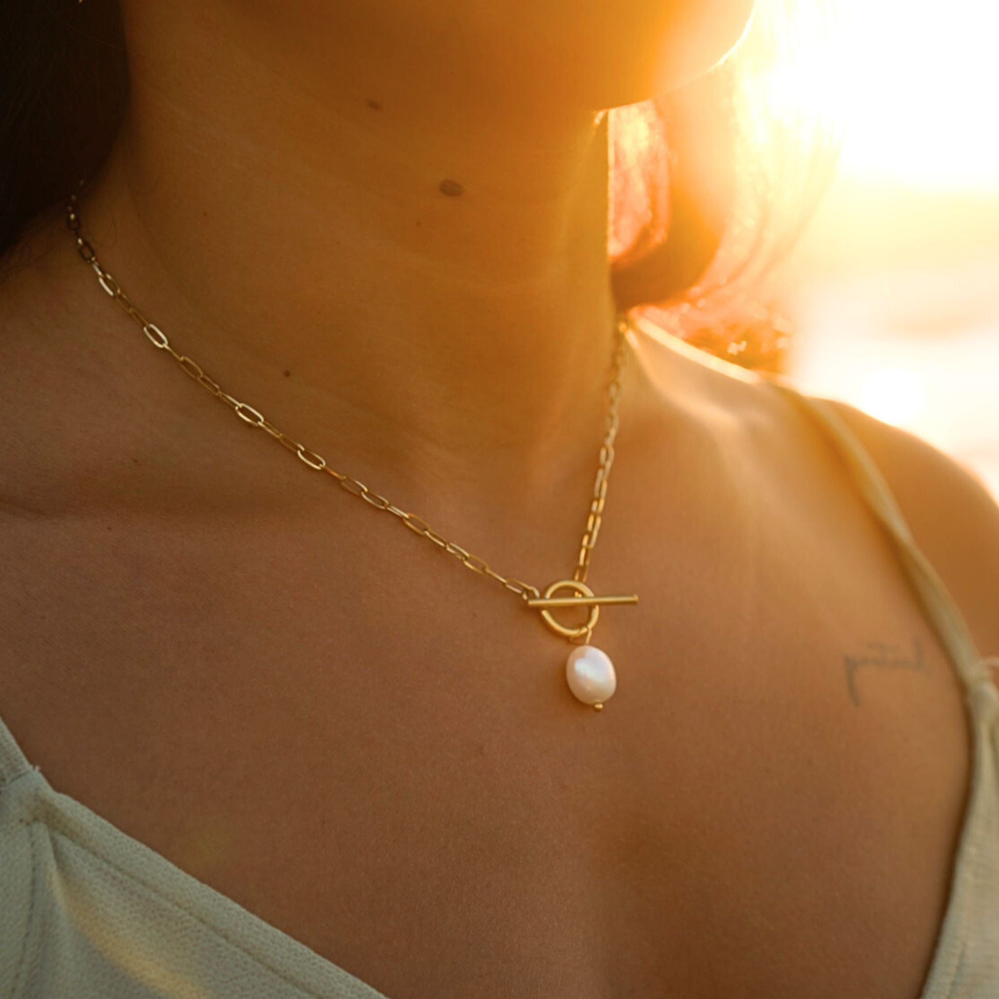 Add a touch of elegance to any outfit with our Mermaid's Treasure Necklace. Featuring a luminous pearl pendant suspended from a beautifully crafted golden knot bar, this necklace exudes sophistication and charm. The front attachment design adds a unique flair, making it an exquisite focal point for any look.