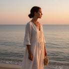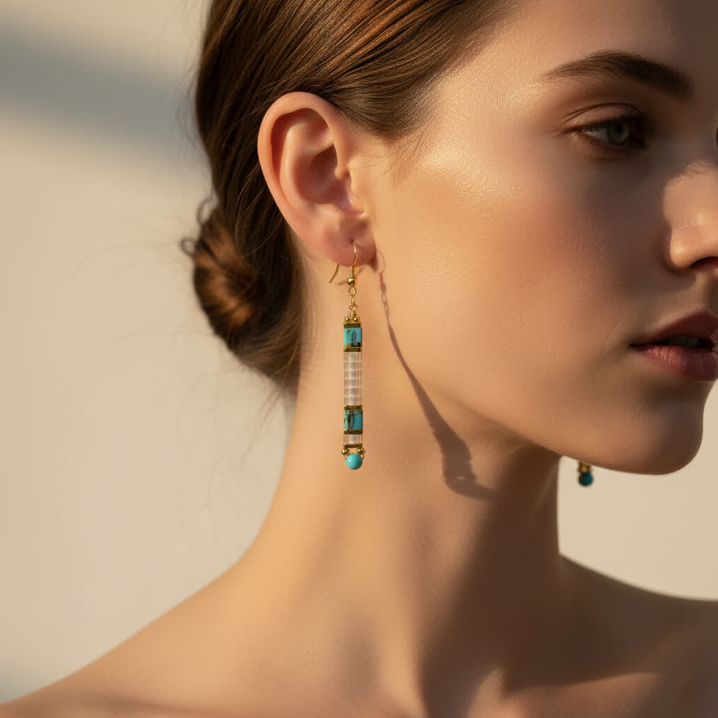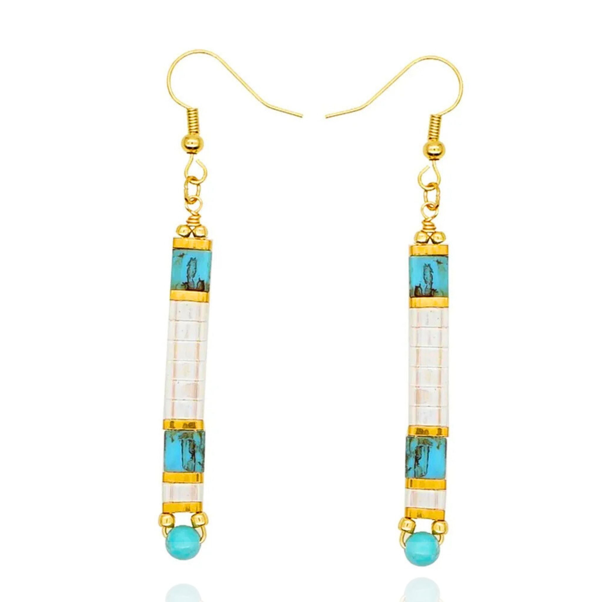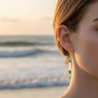 Introducing the BODHI Earrings, featuring a serene mix of white and light blue beads. These earrings offer a tranquil, ethereal feel with a modern, minimalist design.