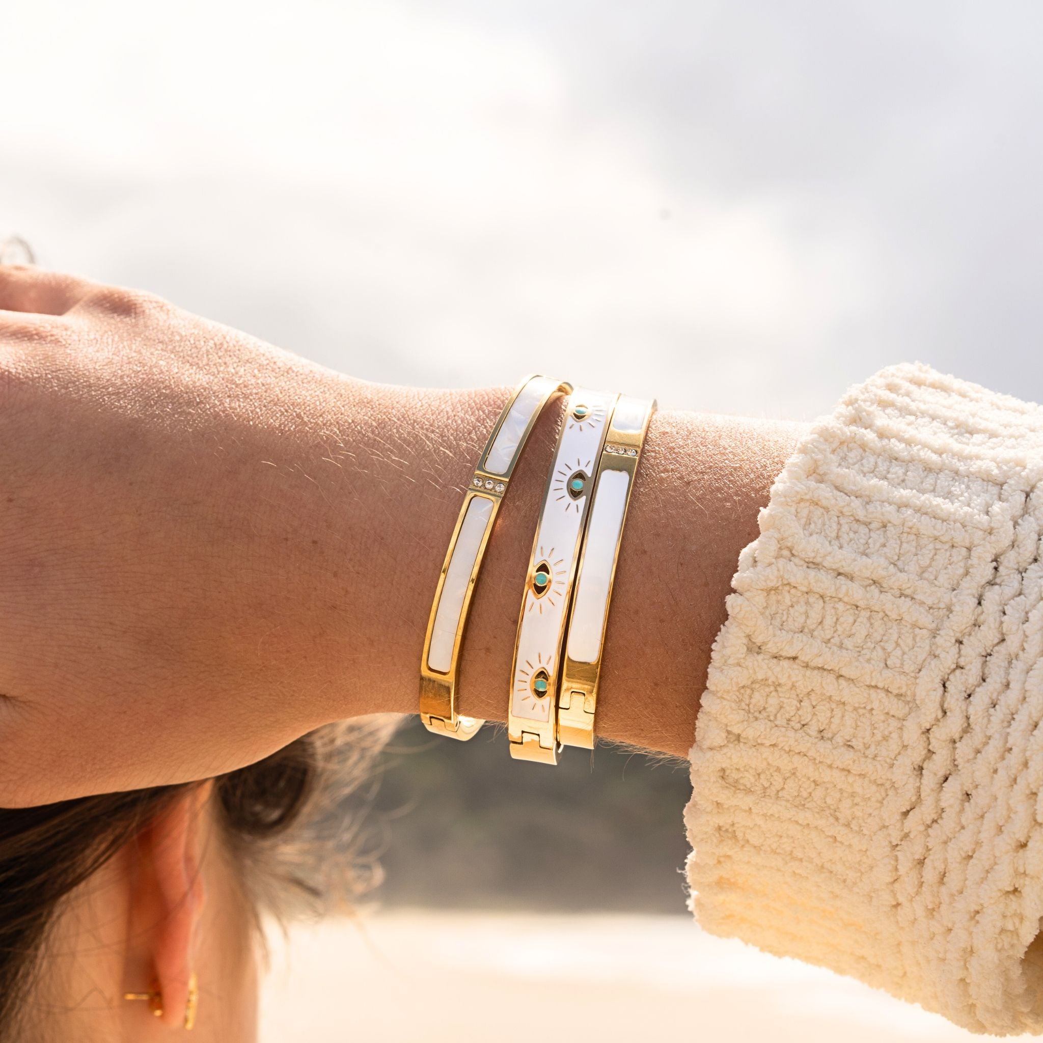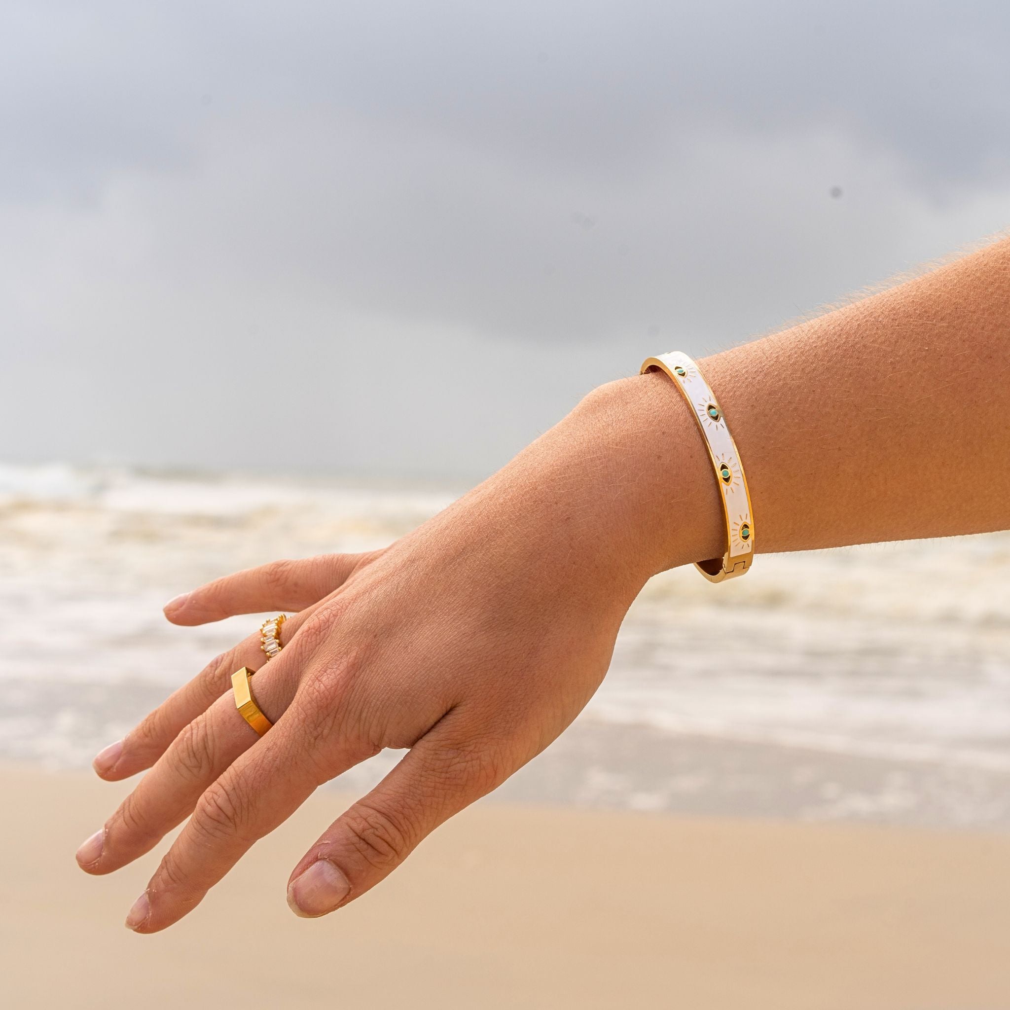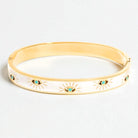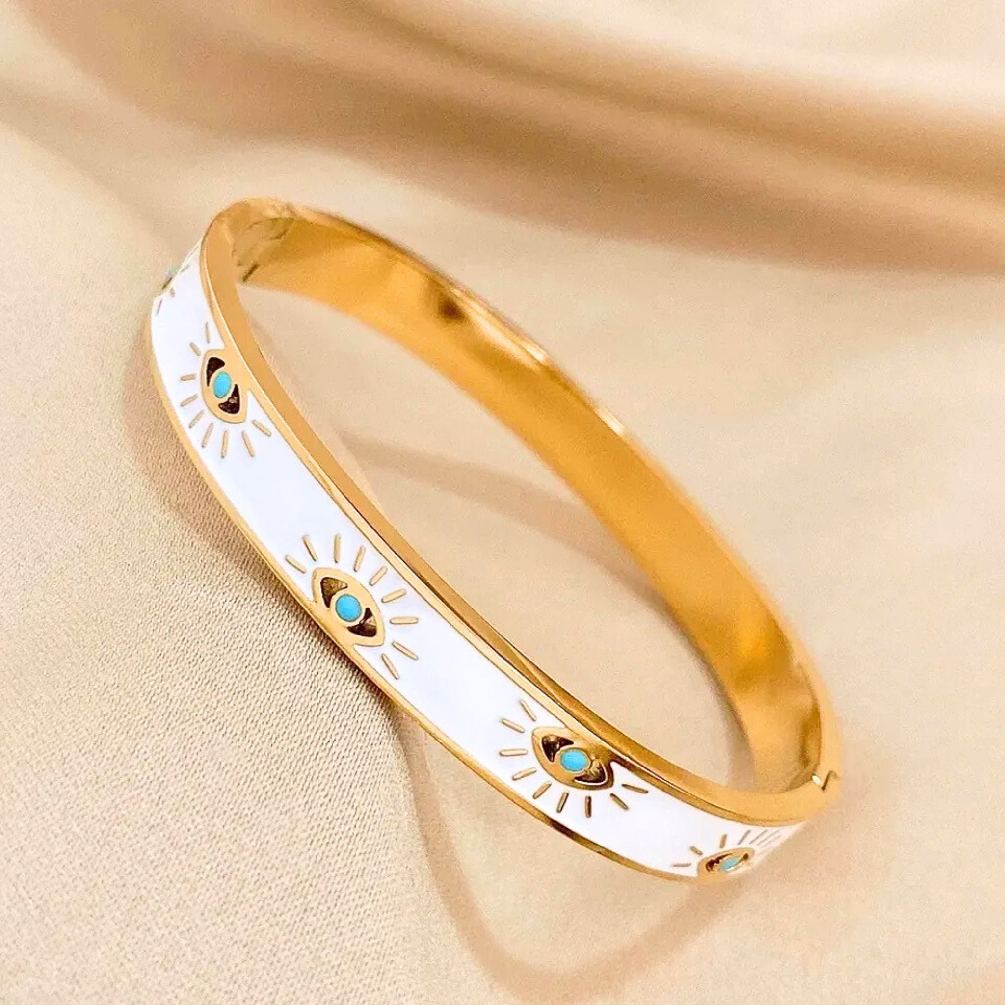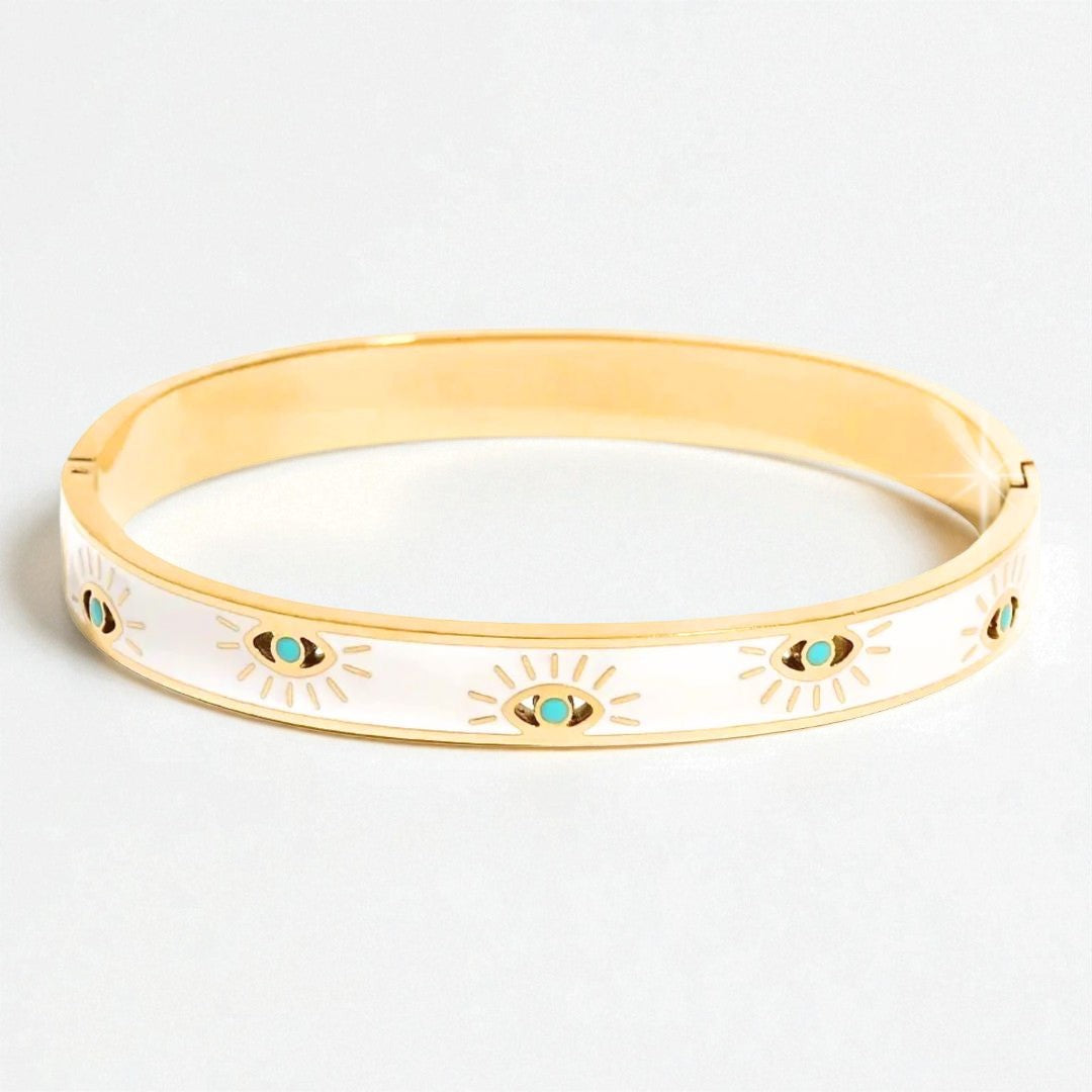 Discover our stunning gold and white Evil Eye bangle. Thoughtfully designed, it features a gleaming gold coloured band paired with a captivating white evil eye design.